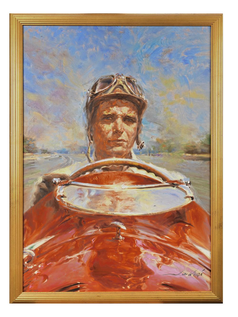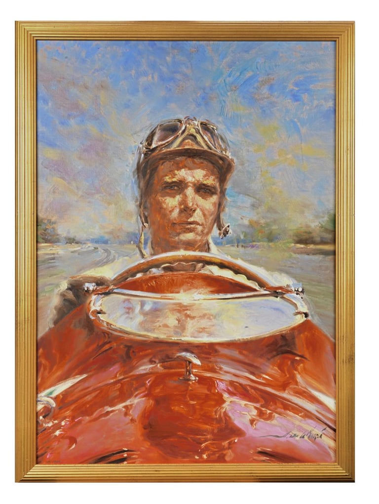 Como no podía faltar entre la parte de los retratos hechos a lo largo de toda su carrera, encontramos a Juan Manuel Fangio, quien fue uno de los mejores pilotos de la historia. Con talento, esfuerzo y respeto, ganó cinco campeonatos del mundo de Fórmula 1 y se convirtió en una leyenda del automovilismo. Y no podía dejar de tener su espacio dentro de la colección "De La María".