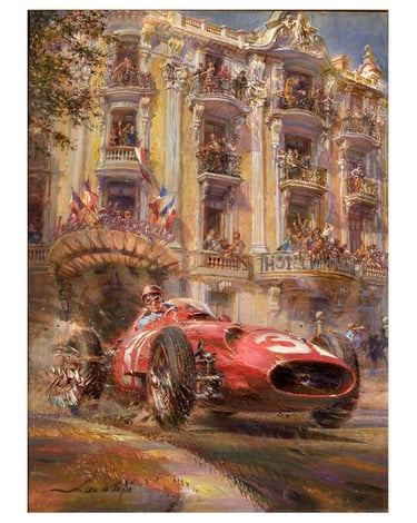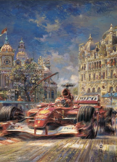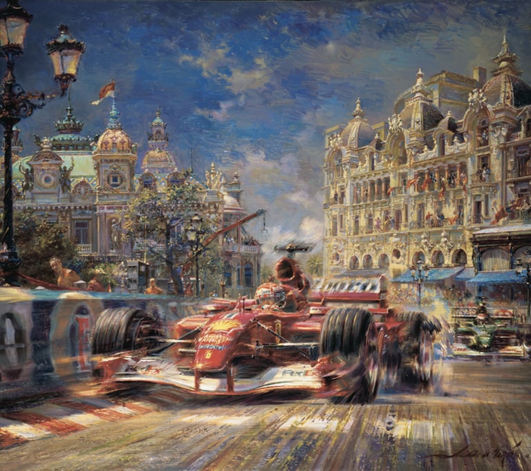 Algunas de las grandes obras que se pueden apreciar sobre la temática de Ferrari, haciendo hincapié sobre todo en el realismo de la escena, combinando movimiento y arte, a la vez que una "pincelada" de historia sobre el Mónaco más clásico (pintura de la izquierda).